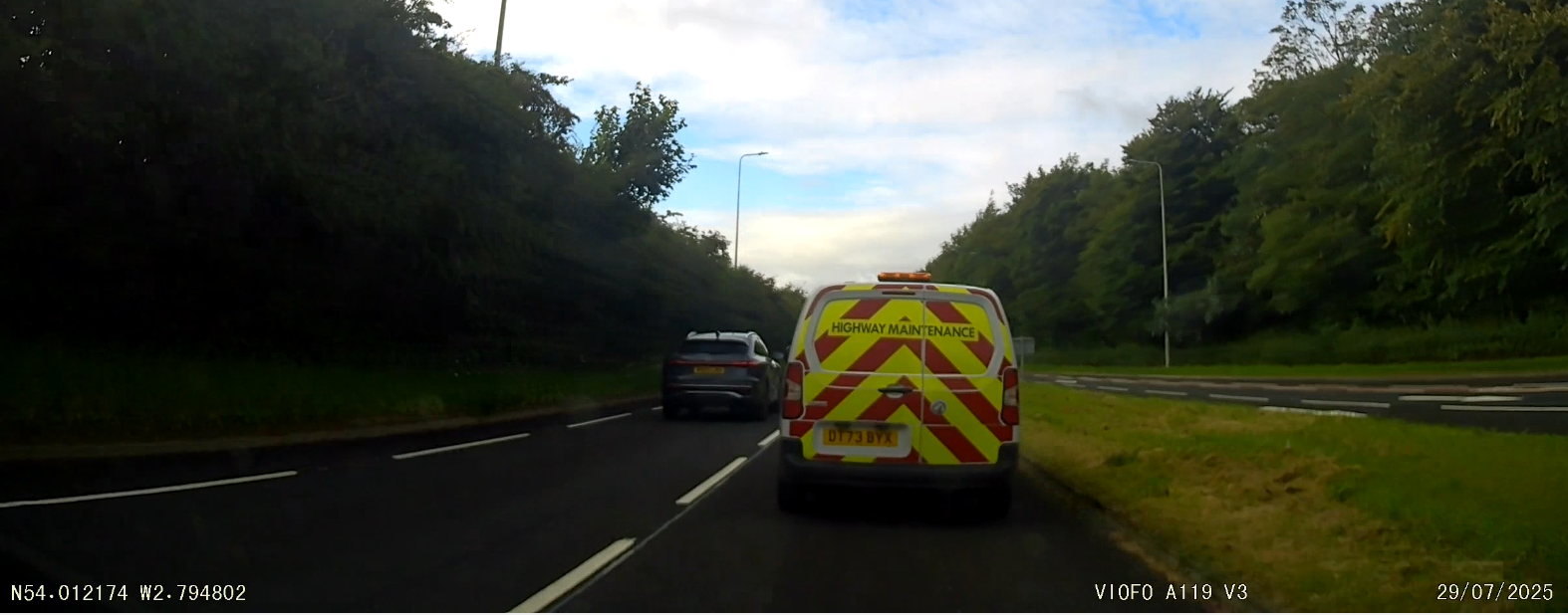 This dangerous idiot in a Toyota Proace. Been going slow for ages. Traffic lights turn green, big gap opens up for both highway maintenance DT73BYX (another idiot who pulls the same stunt later) & me to pull in to the gap. Toyota driver keeps dropping back like they're going to let me pull in but then speeds up to block it off. As the road goes back to 1 lane they then floor it to completely block me off. Dangerous idiot on the road.