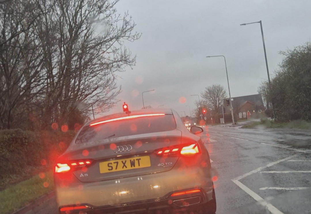 This idiot in an Audi pulled out from the roundabout near the canal heading towards Bathpool without looking to his right and cut my friend and I up. While waiting at roadworks traffic lights at the end of Hyde Lane the thing in the passenger seat literally hung out of her window shouting abuse and giving disgusting gestures. I don't know what you think I was doing but it was just what was being done to us but on a lesser level. Because we were indicating to turn into Hyde Lane the prick driving decided to sit at the green light and obstruct us from turning in while revving his engine ridiculously. When he did finally drive off he went straight through a red light. Certainly does not deserve a driving license!