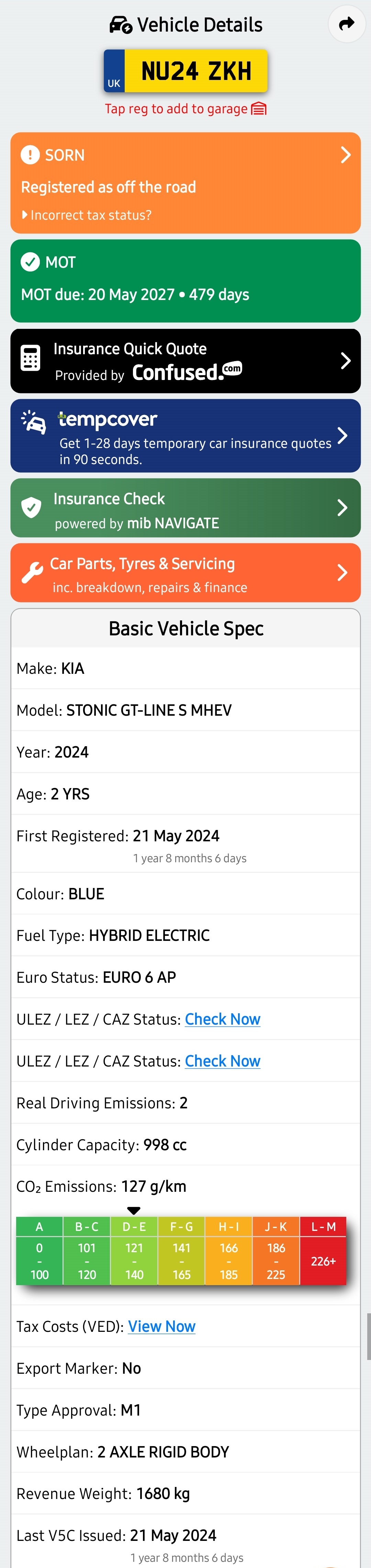 Matches with a BLUE HYBRID ELECTRIC KIA manufactured in 2024. It is currently SORN and the tax is due. The MOT status is No details held by DVLA