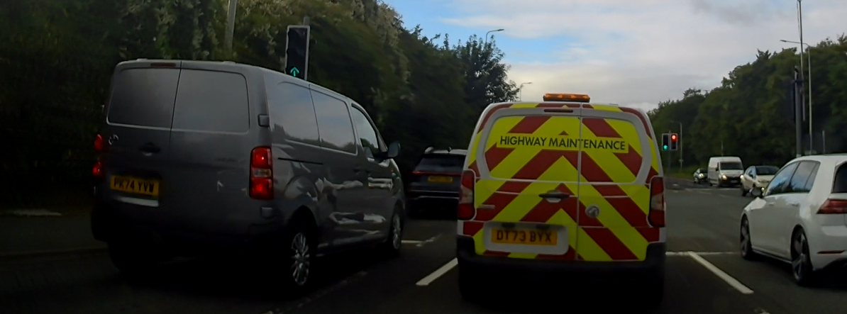 This dangerous idiot in a Toyota Proace. Been going slow for ages. Traffic lights turn green, big gap opens up for both highway maintenance DT73BYX (another idiot who pulls the same stunt later) & me to pull in to the gap. Toyota driver keeps dropping back like they're going to let me pull in but then speeds up to block it off. As the road goes back to 1 lane they then floor it to completely block me off. Dangerous idiot on the road.